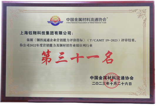 中國金屬材料流通協會 2022年度營銷能力及鋼鐵銷售業績位列行業第三十一名