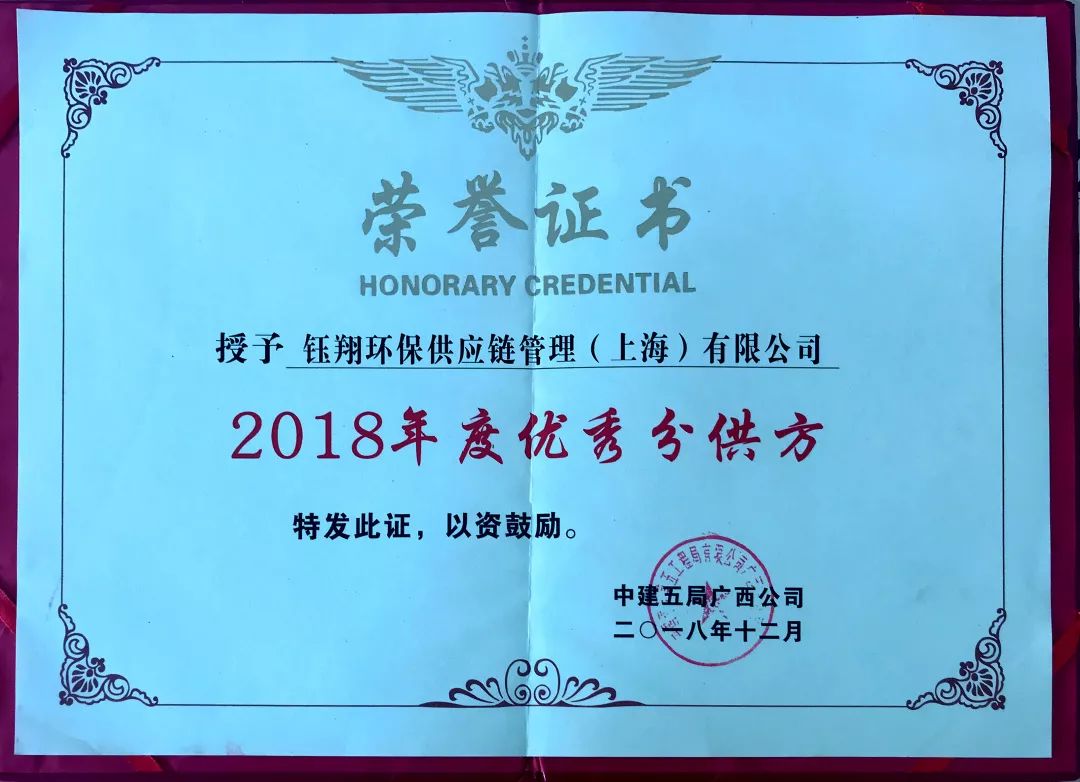 鈺翔環(huán)保供應(yīng)鏈管理(上海)有限公司被中建五局廣西公司評為優(yōu)秀分供方