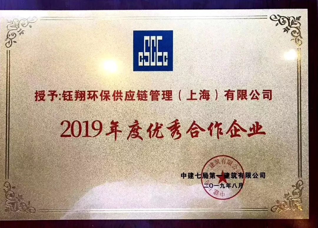 近日,鈺翔環(huán)保供應(yīng)鏈管理(上海)有限公司被中建七局第一建筑有限公司評為2019年度優(yōu)秀合作企業(yè)。