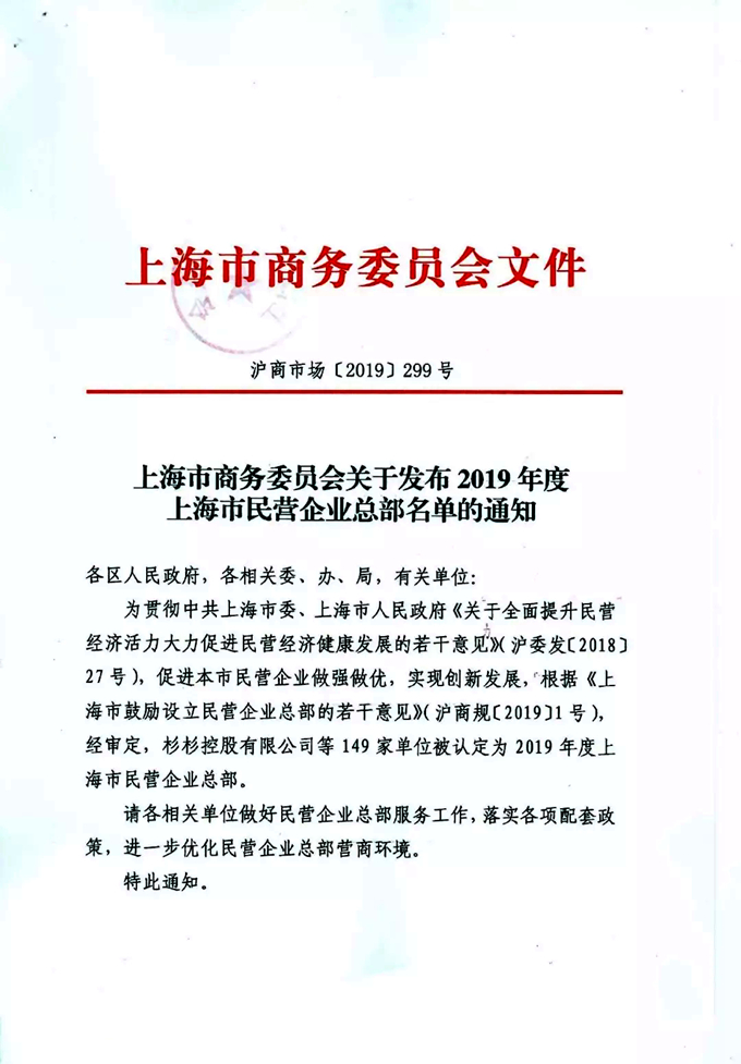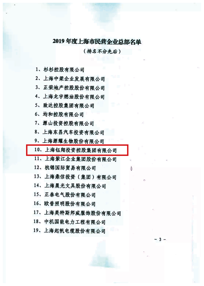 2019年12月30日,上海市商務委發布2019年度上海市民營企業總部名單,上海鈺翔投資控股集團有限公司等149家單位被認定為2019年度上海市民營企業總部,這一認定是鈺翔控股集團在新的一年實現更好更快發展的開端。