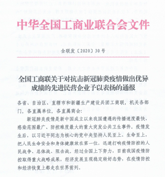 為大力弘揚在抗擊新冠肺炎疫情中形成奉獻大愛精神,充分激發廣大民營經濟人士的責任感、使命感、榮譽感,日前,全國工商聯決定對1000家“抗擊新冠肺炎疫情先進民營企業”給予表揚,鈺翔集團喜獲全國工商聯表彰。