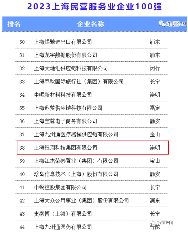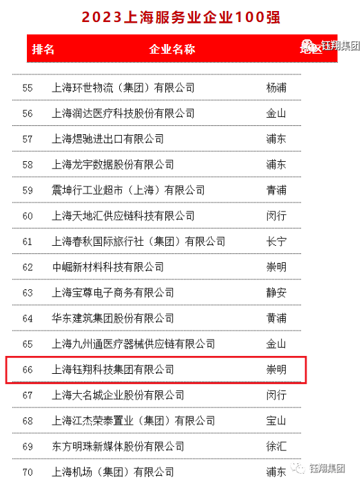 上海鈺翔科技集團有限公司2022年實現(xiàn)營業(yè)收入76.96億元,榮獲“2023上海民營企業(yè)100強第61名”、“2023上海服務業(yè)企業(yè)100強第66名”、“2023上海民營服務業(yè)企業(yè)100強第38名”三項榮譽。