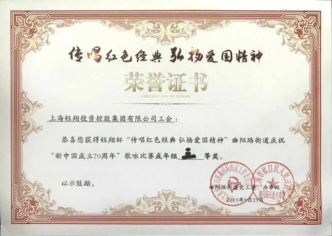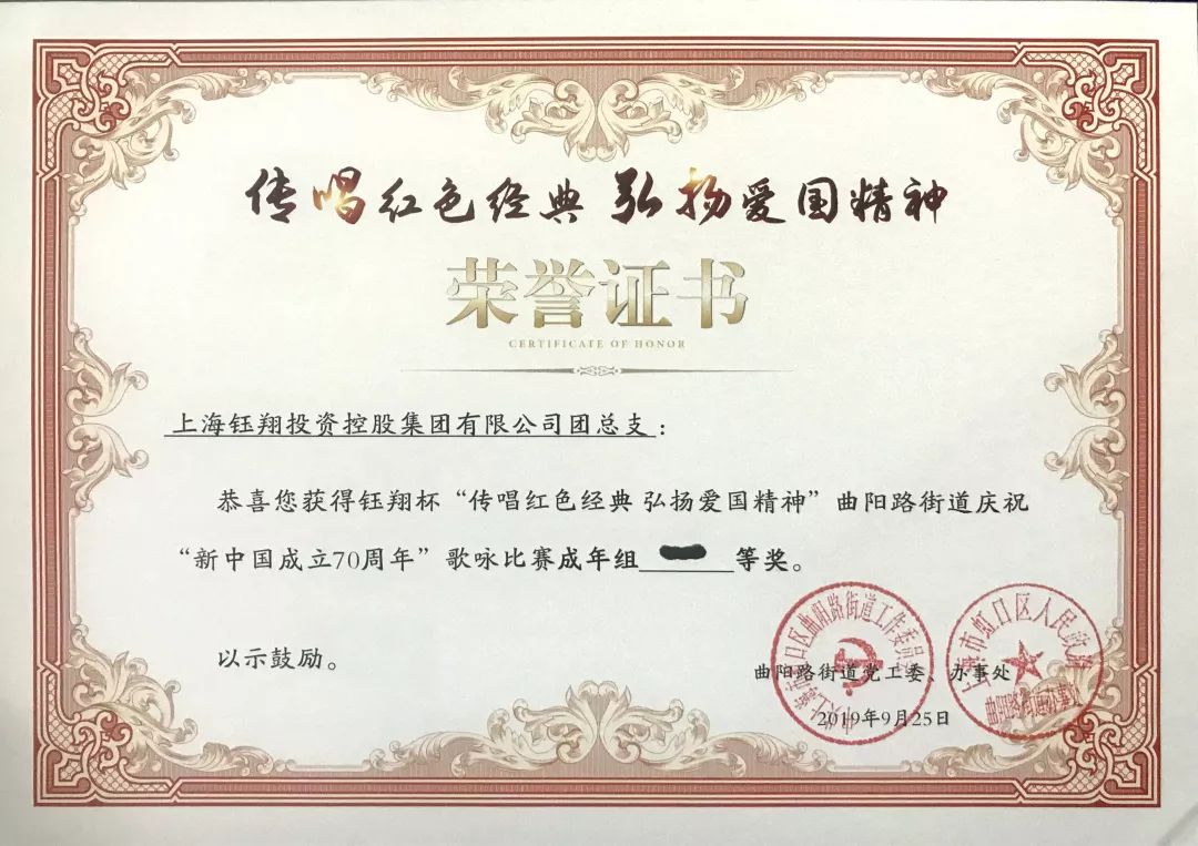 9月25日,傳唱紅色經典、弘揚愛國精神——“鈺翔杯”曲陽路街道慶祝“新中國成立70周年”歌詠比賽決賽圓滿落下帷幕。集團團總支和工會兩支隊伍進入決賽,決賽中集團團總支演唱的《我愛你中國》榮獲一等獎,集團工會演唱的《中國人》榮獲三等獎,取得了優異的成績。
